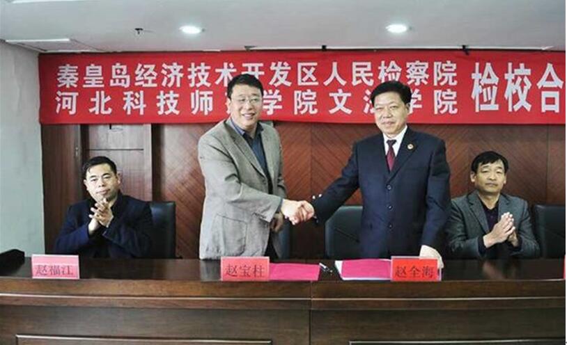 2017年4月14日,yl23411永利集团官网院与秦皇岛经济技术开发区检察院举行“检校共建”合作协议签字仪式,yl23411永利集团官网院党委书记郝东、院长赵宝柱、副书记副院长赵敏、副院长赵福江、秦皇岛开发区检察院党组书记、检察长赵全海、副检察长刘志辉等领导出席签字仪式。