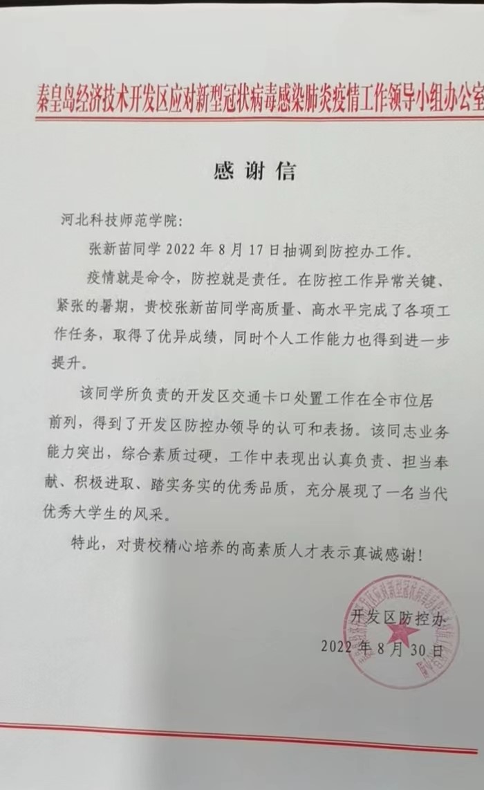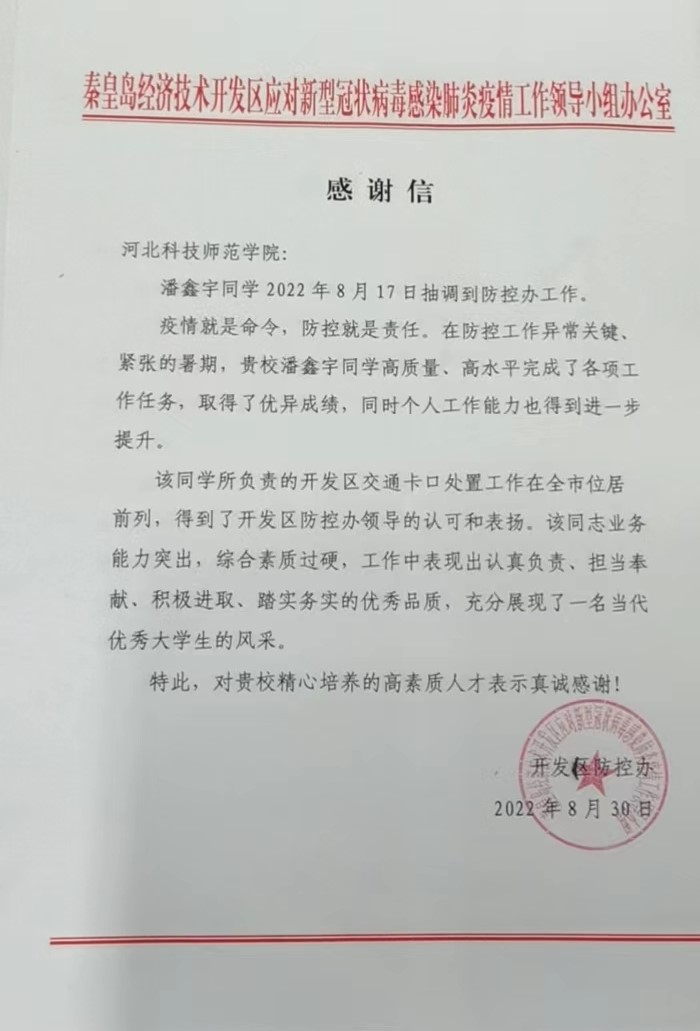2022年9月16日,秦皇岛市疫情防控办领导刘汶隆和于俊国莅临永利集团官网,对暑期疫情志愿者工作表示感谢,并为志愿者颁发表扬信。yl23411永利集团官网院党委书记郝东接待了防控办来宾并进行洽谈。防控办表示,面对严峻的疫情防控形势,yl23411永利集团官网院积极响应国家疫情防控号召,在暑期组织学生参与本市疫情防控工作。疫情就是命令,防控就是责任,在防控工作异常关键、紧张的暑期,潘鑫宇和张新苗两位志愿者所负责的开发区交通卡口处置工作在全市位居前列,得到了开发区防控办领导的认可和表扬。高质量、高水平完成了各项工作任务,他们工作中表现出认真负责、担当奉献、积极进取、踏实务实的优秀品质,充分展现了当代优秀大学生的风采。