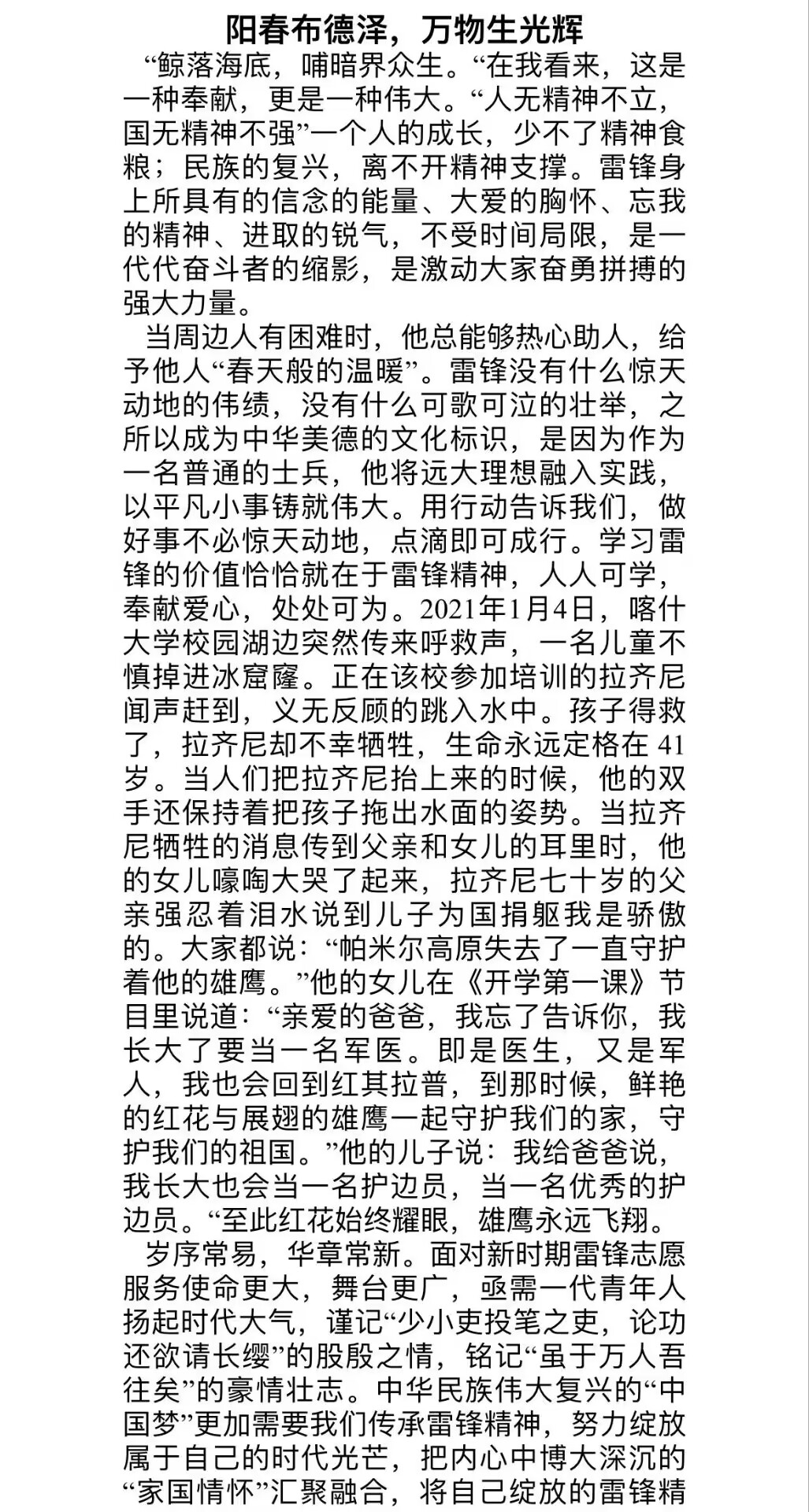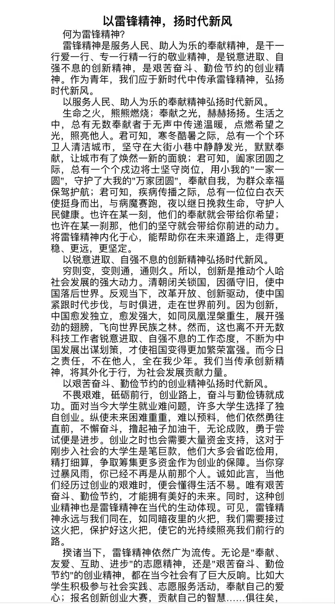 通过举办此次“春风十里暖人心,雷锋精神伴我行”征文比赛,进一步弘扬了雷锋精神,让更多的同学们了解雷锋,学习雷锋。此次比赛旨在加强雷锋精神的教育意义,提高同学们的道德素质,增强社会责任感和集体主义精神。通过征文比赛引导同学们以雷锋为榜样,将雷锋精神运用到大学生活中,砥砺前行,自觉成为雷锋精神的传承者和发扬者。