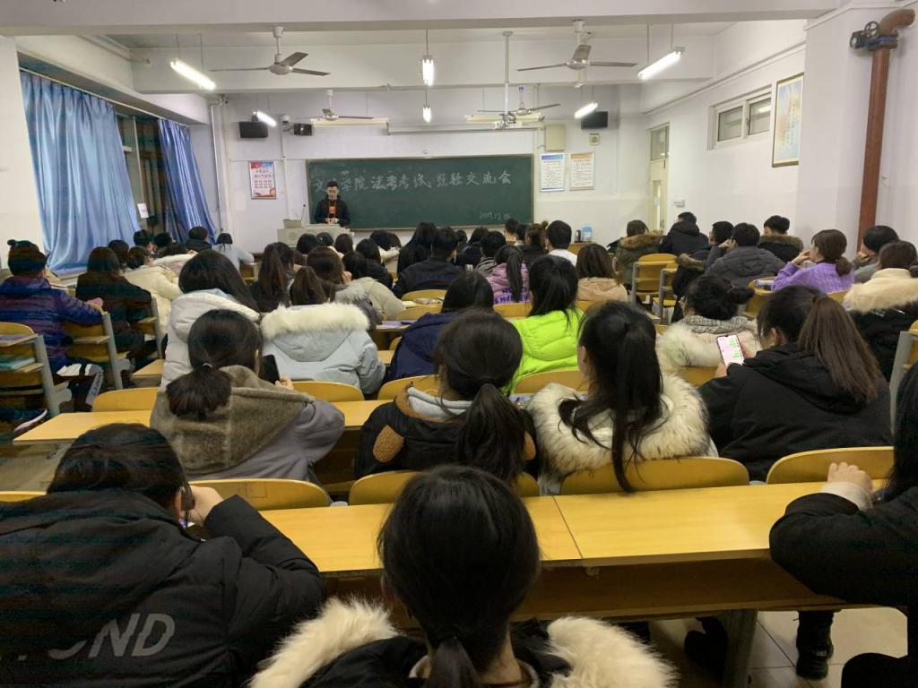 为了给同学们传授司法考试的经验和体会,让同学们对司法考试有更深入的了解,2019年12月6日晚上6点,yl23411永利集团官网院在综合楼806教室举办了司法考试经验交流会。此次交流会有幸邀请到了李涵、田宏涛、姚晓莹、李宇薇、张悦五位学长学姐,他们以优异的成绩通过了今年的司法考试,17级法学和18法学的90多名同学参加了此次交流会。