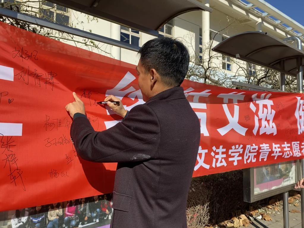 在活动过程中,yl23411永利集团官网院青年志愿者协会准备了宣传横幅、抗艾知识宣传手册及宣传海报。志愿者通过发放防艾宣传手册、号召同学在宣传横幅上签名等形式普及抗艾知识。yl23411永利集团官网院党委书记莅临指导工作,老师和同学积极响应,纷纷在抗艾宣传横幅上签名。
