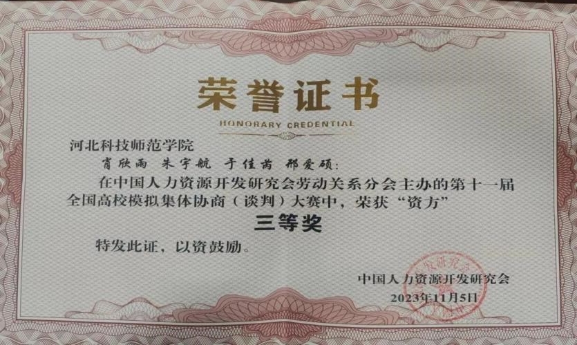 经过两天的激烈角逐,永利集团官网学生表现优异,资方代表队荣获大赛三等奖,劳方代表队荣获大赛二等奖,成玥霖、邢爱硕两位同学荣获最佳谈判员一等奖,王晓燕、刘秀清、辛宇鹤三位老师荣获优秀指导老师一等奖。